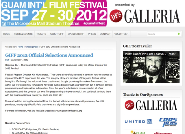 […] wrote up some nice things about us during our stay in Guam screening our video for Caving In at the Guam-USA International Film Fest. Jacqueline included a link to my Guam 2012 video which was was really cool. Check out the full […]