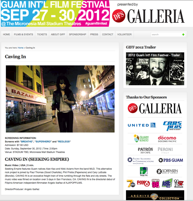 I’m proud to announce our Seeking Empire “Caving In”music video was chosen to be part of the weekend’s programming. Going down the list are some really talented international filmmakers. This will be its Pacific-Asia Premiere. Sept 30th in our favorite protectorate of Guam. Thank you Muna Brothers!